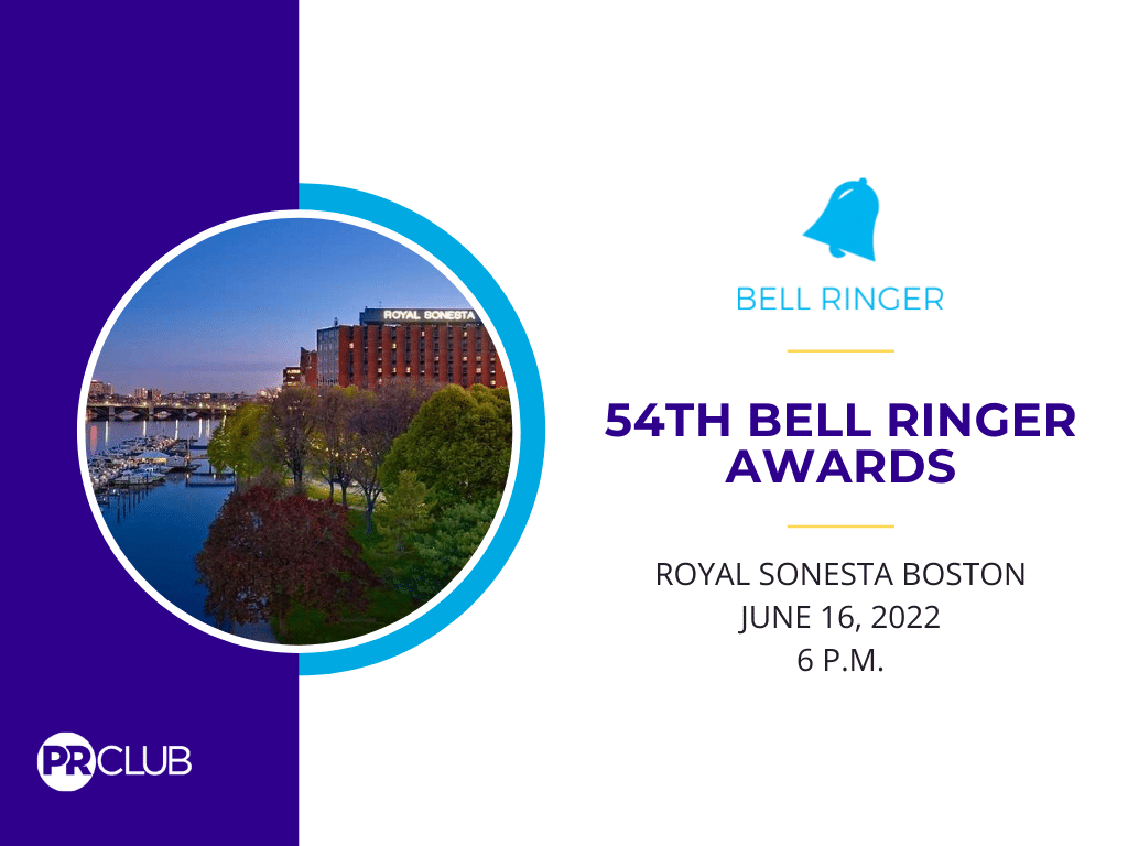We are delighted to announce that the PR Cub will host the 54th Bell Ringer Awards ceremony on June 16, 2022, at the Royal Sonesta Boston from 6-10 p.m. Returning to an in-person event after two years of virtual ceremonies, the annual event will celebrate the work of public relations, marketing, and communications professionals from across New England. Additionally, the winners of the Striker and Ringer professional awards, along with the John J. Molloy Crystal Bell for lifetime achievement, will be announced. This year, the event will feature a new format that maximizes networking time for attendees to meet and celebrate together.