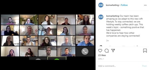 At KoMarketing, proactive communication is the key to how we’re making sure team members are engaged and feel as comfortable as possible shifting to the remote work environment. In addition to weekly company-wide status meetings, program leads and directors consistently and proactively reach out to their teams to discuss campaigns, weekly assignments, and broader professional and personal situations. The success of our team members overall well-being is just as critical as our client commitments throughout this challenging time.