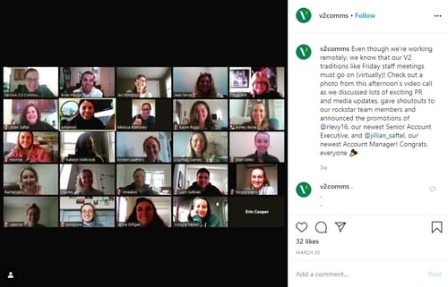 At V2 Communications, we’ve created a “Kitchen Chats” channel on Microsoft Teams where we can talk about everything from Tiger King to sharing cute photos of our work from home buddies, aka our cats and dogs! We’ve also been running virtual game nights and have gotten a start on choosing a new read for our book club.